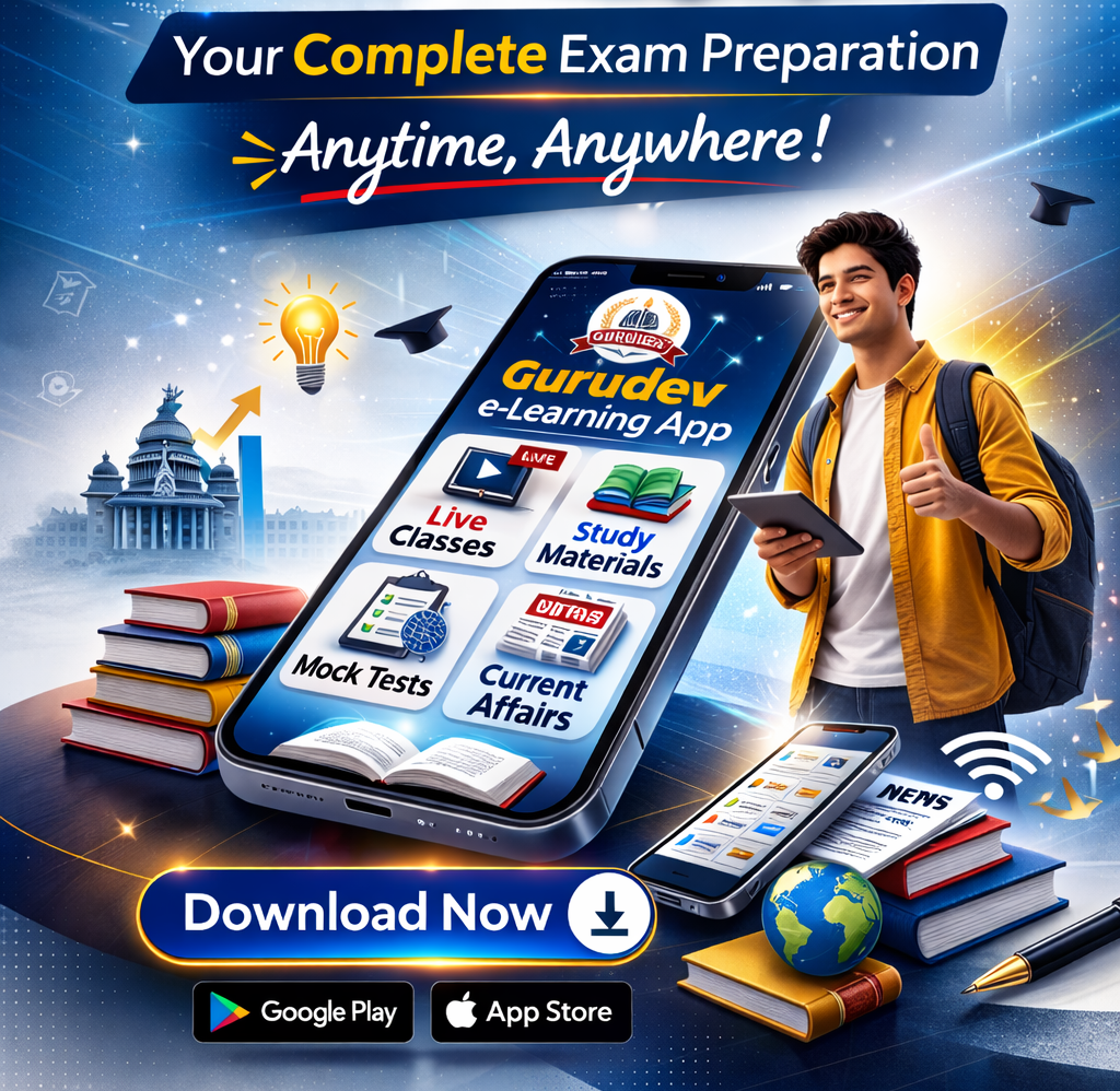 Download the Gurudev e-Learning App to access full courses, free content, current affairs, e-magazines and mock tests for all competitive exams. Study anytime, anywhere.